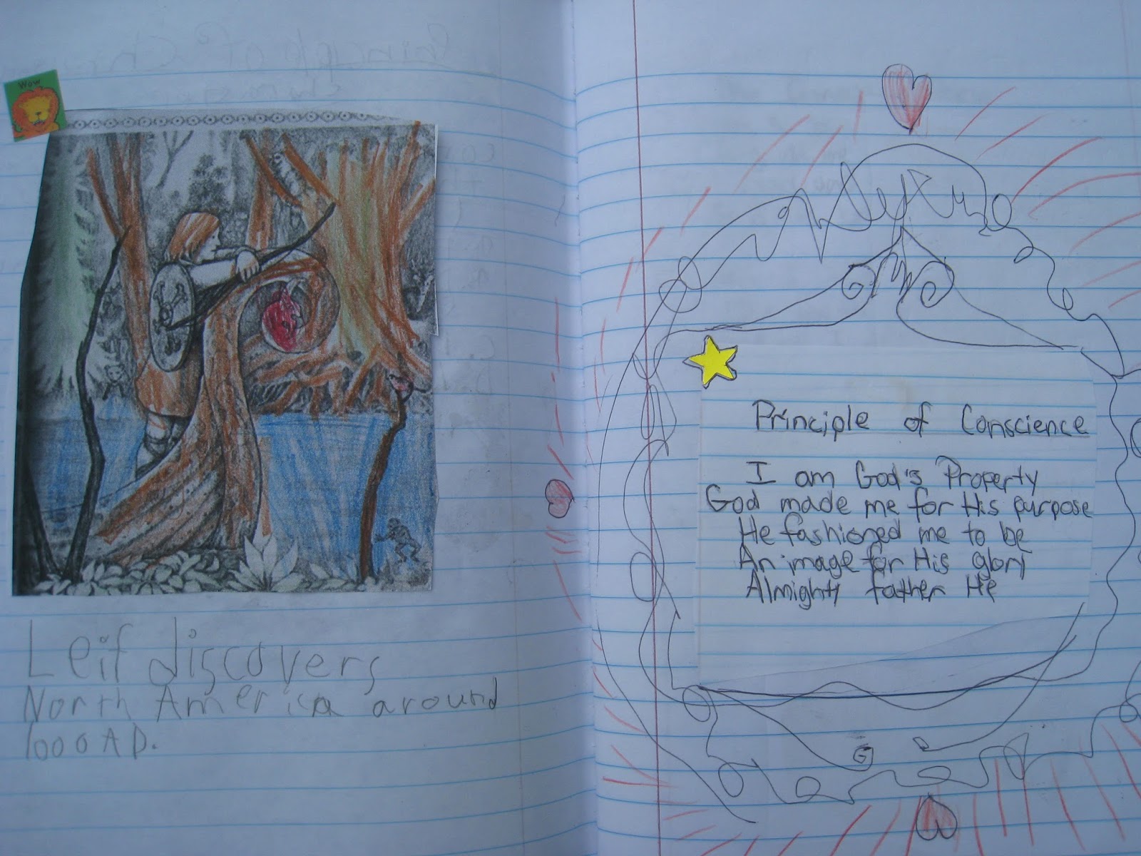 These pages are from Kaden's notebook. At age 8 he's working his way through our Early American History for primary grades and we're very impressed with the maps and format of his notebook. The map of the world includes labels for each continent and he used the description in The Vikings to label his Viking longship. Well done!